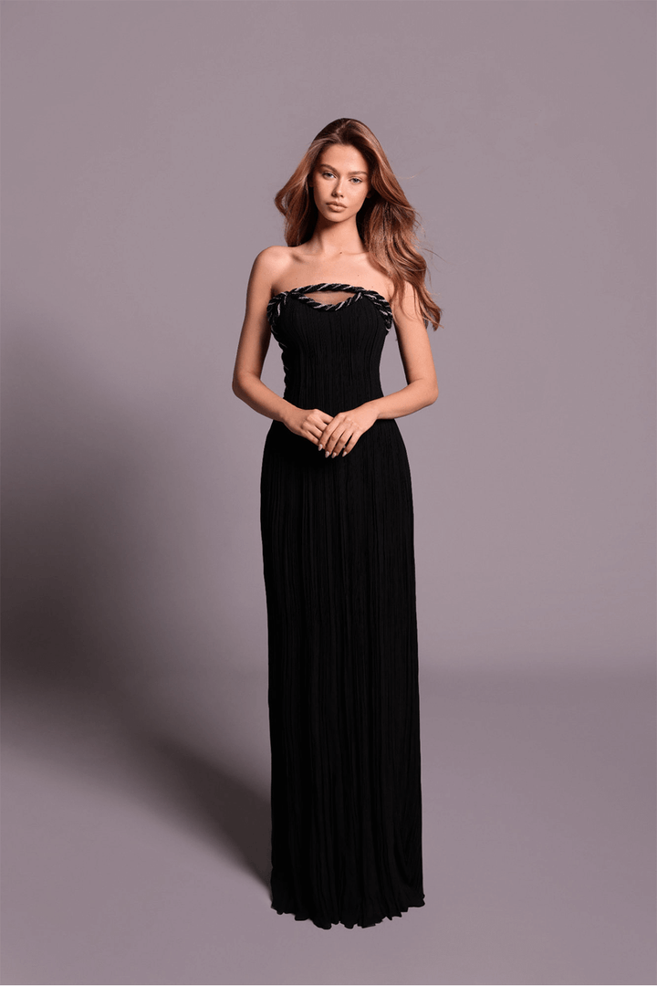 It features a strapless design with a structured, pleated fabric and a straight, floor-length silhouette.