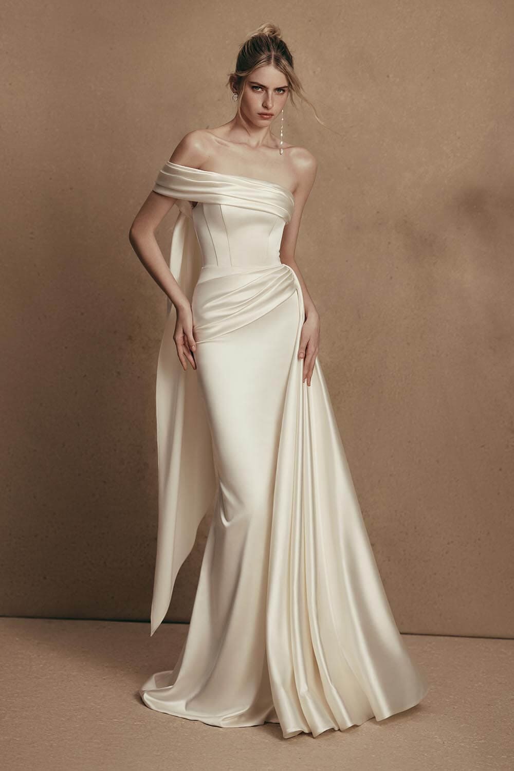 سيلفينا هو ثوب زفاف من الساتان مع كورسيه ضيق مزين باللف. الجزء العلوي لديه خط رقبة غير متماثل ومثبت على شريط واحد عريض. إنها مقترنة بتنورة هادلة في صورة ظلية مستقيمة مع تنورة فوقية بقصة غير متماثلة.