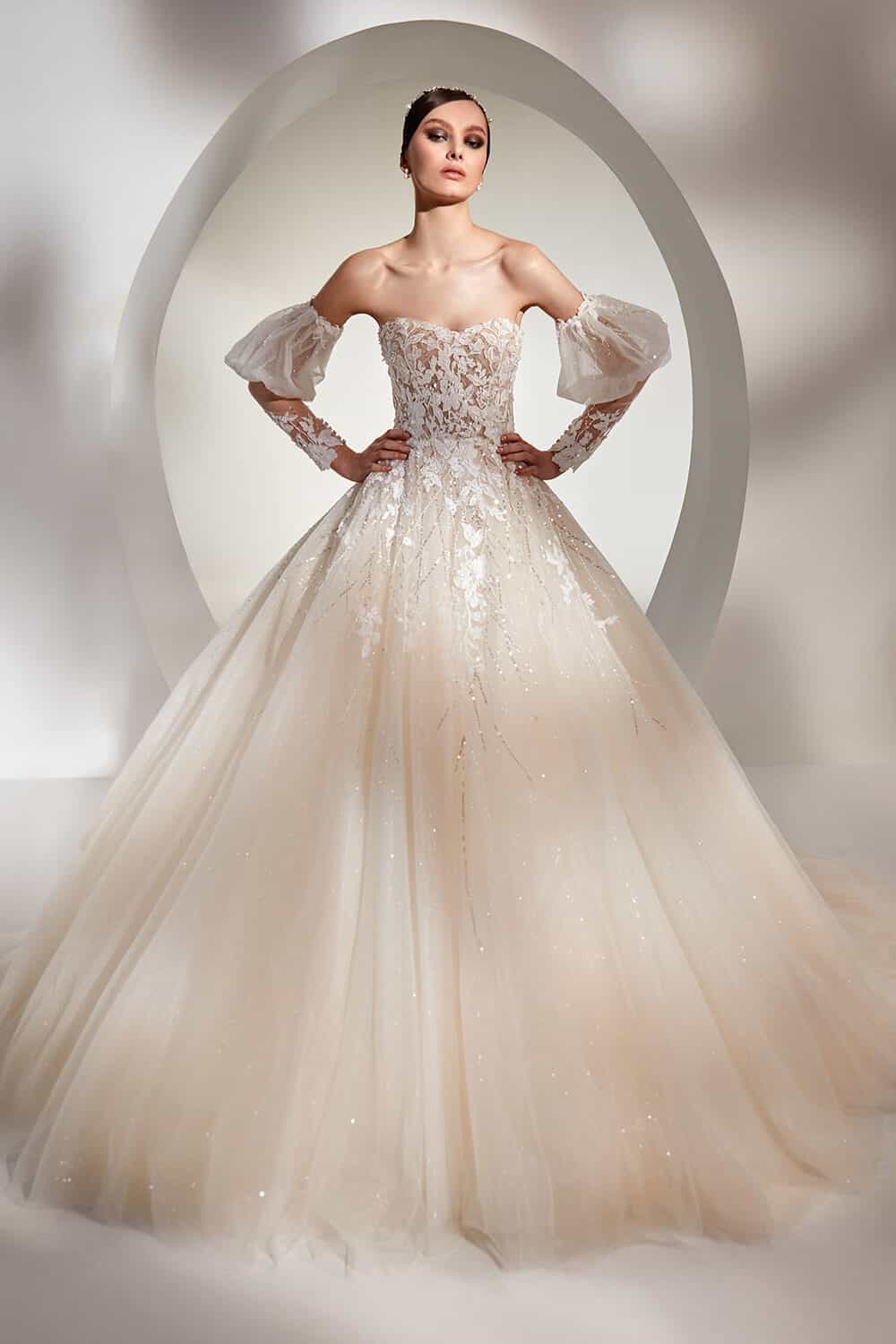 إذا كنت تبحثين عن إطلالة زفاف رومانسية في يومك الكبير ، فإن أركاديا هو بالتأكيد الفستان المناسب لك! فستان زفاف بقصة الأميرات مع تنورة من التول العاجي الضخمة ، مطرزة بالدانتيل وزخارف جميلة تضفي تأثيراً خفيفاً ثلاثي الأبعاد وتضيء صدّار العنق المستدير. يقترن بأكمام قابلة للإزالة لتعزيز بريق هذا الفستان.