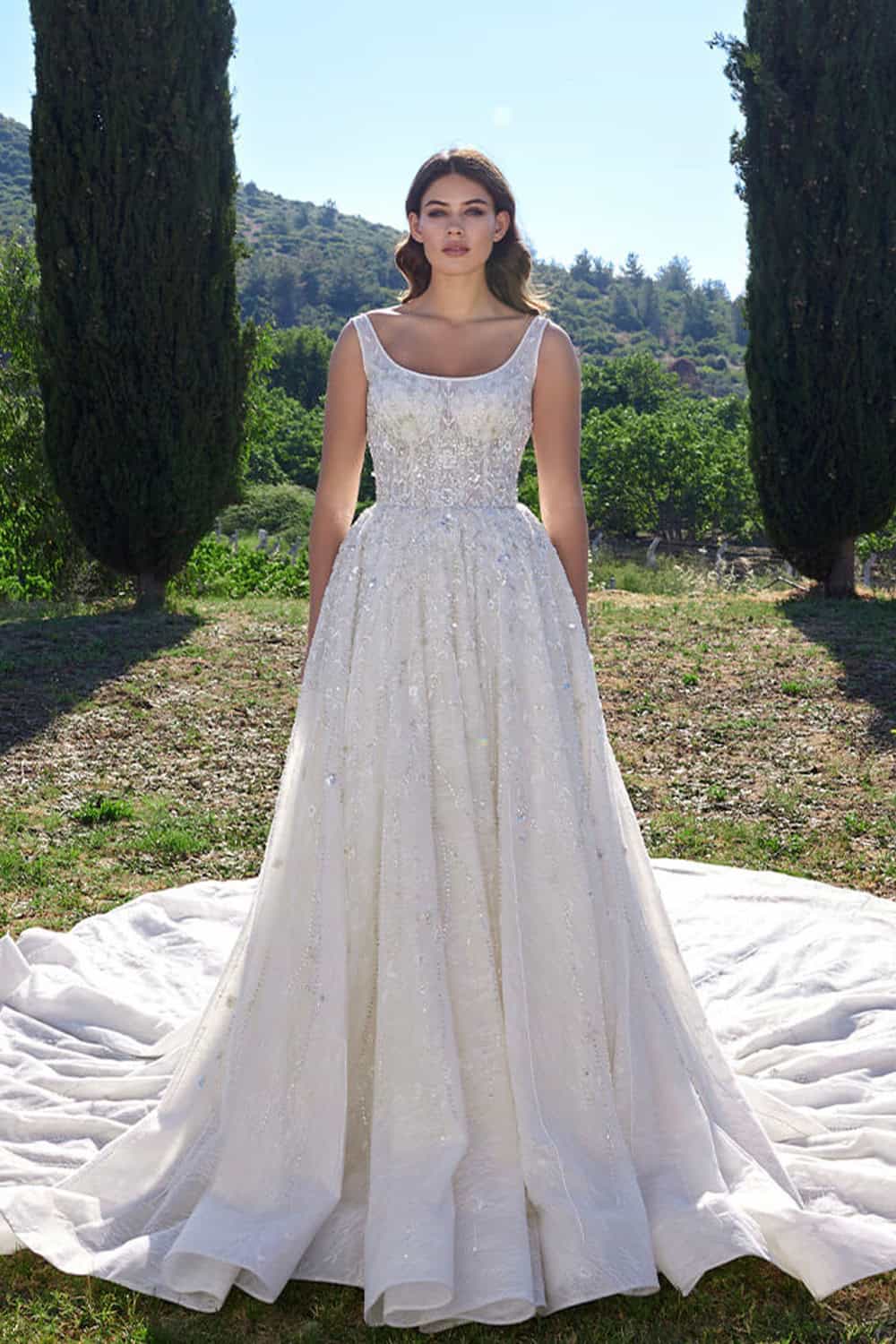Embrace sophistication with our enchanting floral ball gown, perfect for both classic and contemporary brides. This cream-colored beauty showcases a delicate scoop neckline and is embellished with exquisite handmade floral embroidery and radiant beads. The opulent French lace lining enhances its elegance, while the sweeping train guarantees a stunning entrance. Inspired by the charm of summer gardens, this gown is ideal for summer weddings. Accompanied by a coordinating embroidered veil, it ensures your special day is truly unforgettable.