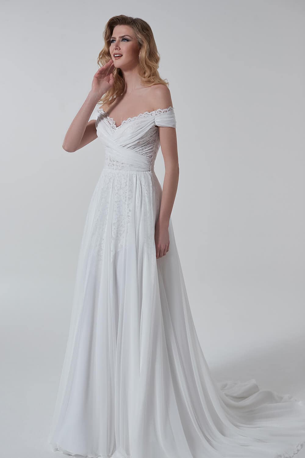 A sexy off-the-shoulder gown with a scalloped neckline designs for a unique style. The crossed bodice falls elegantly in a flowy tulle skirt with an under-layer of floral lace, making it the perfect bridal gown for a romantic and elegant look! Shop this look by Maison Signore at Esposa Privé, Dubai!