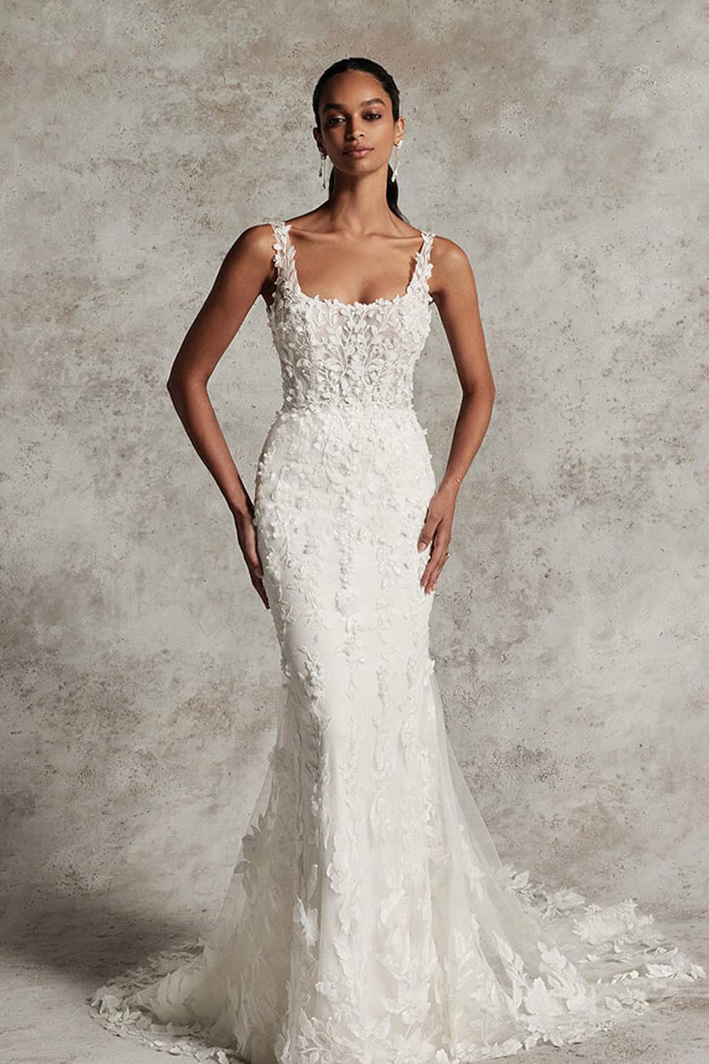 Embrace powerful femininity with this stunning fit and flare gown. The square neckline and natural waistline enhance curvy figures, while dramatic skirt layers of lace and tulle create fluid movement. With expressive floral details and a chapel-length train, this gown beautifully embodies a romantic and captivating style. Perfect for unforgettable moments.