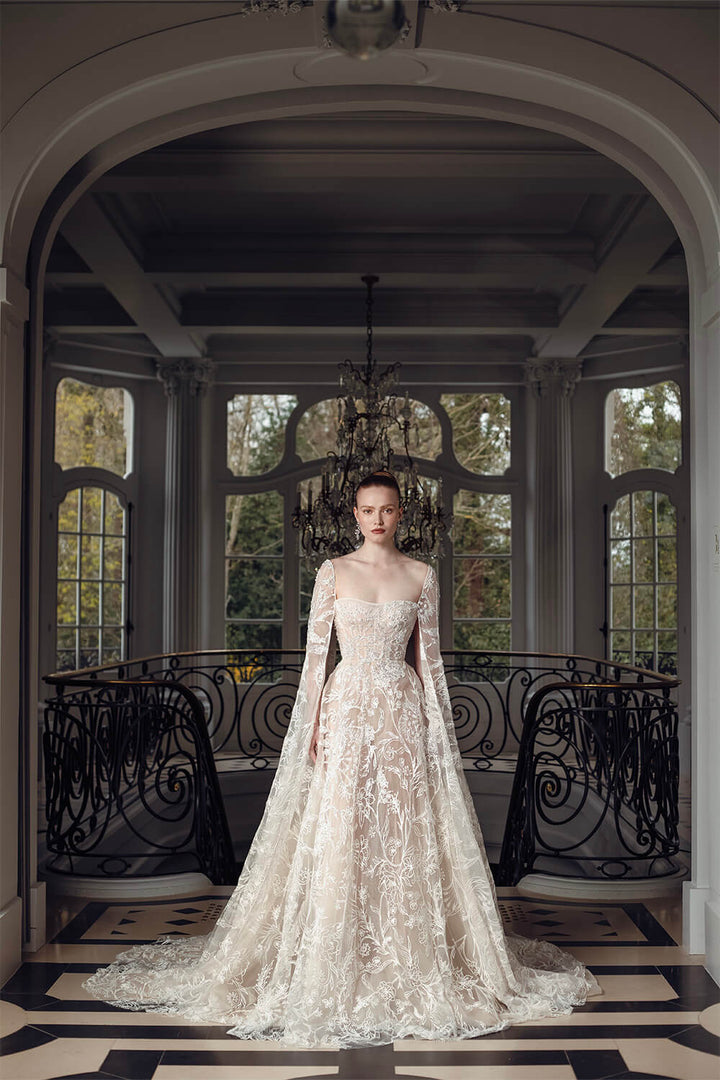 Step into elegance with this stunning A-line dress featuring a sophisticated square neckline and a fitted bodice that accentuates your silhouette.