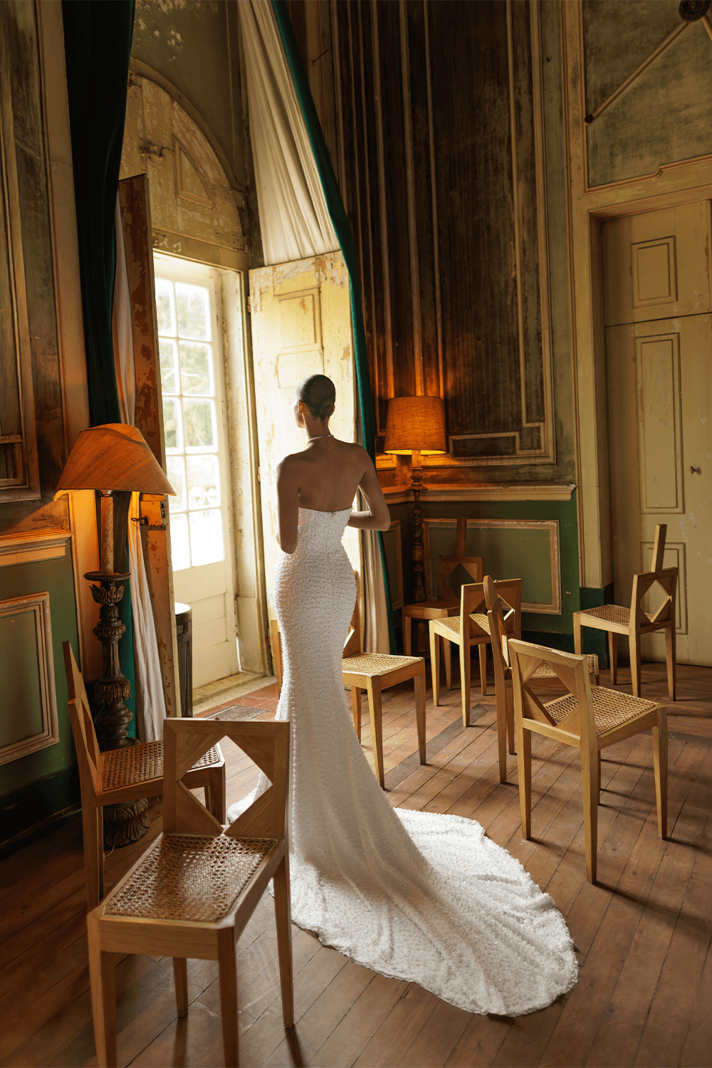 The gown embraces a mermaid silhouette, sculpting the figure before extending into a dramatic overskirt that flows into a sweeping train.